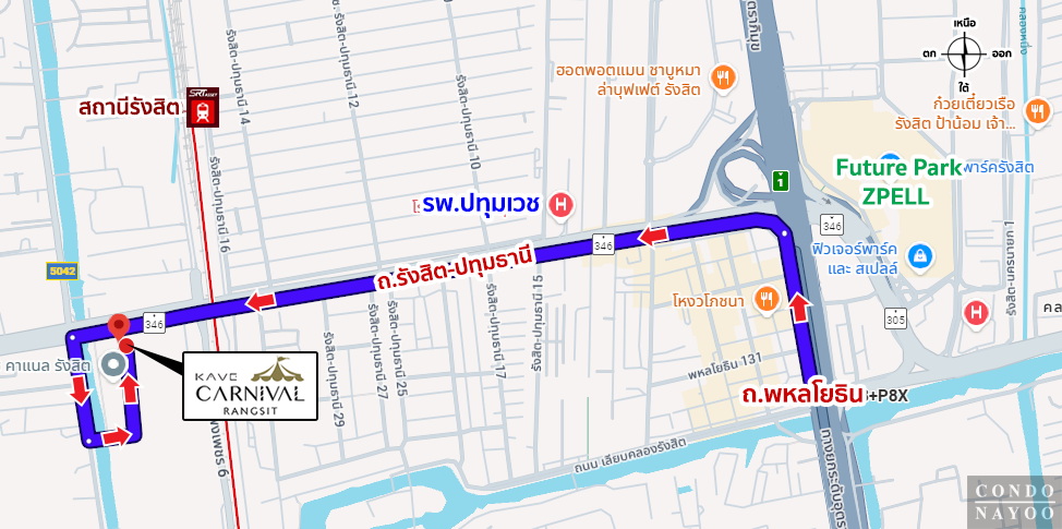 ถนนพหลโยธิน ⇒ ถนนรังสิต-ปทุมธานี ⇒ ซอยรังสิต-ปทุมธานี 33 ⇒ ถึงโครงการ Kave Carnival รังสิต ทางฝั่งซ้ายมือ ใช้ทางเข้า-ออกเดียวกันกับโครงการ atmoz kanaal รังสิต