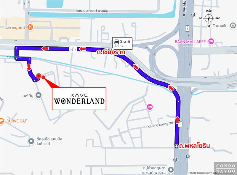 ถนนพหลโยธิน ⇒ ถนนเชียงราก ⇒ ถึงโครงการ Kave Wonderland ทางฝั่งซ้ายมือ