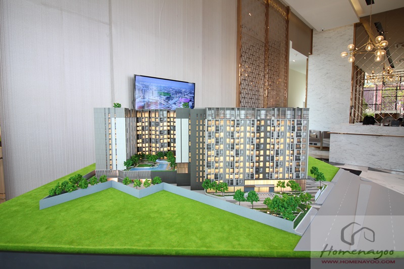 ภาพจำลองตำแหน่งอาคารจากมุมสูง ลักษณะอาคารจะแบ่งเป็น 2 Tower ตั้งอยู่บนโพเดียม 1 อาคาร ชั้น 1-3 จะเป็นอาคารจอดรถและ Grand Lobby, Business room, Co-working Space, Private Lobby และสามร้านค้าที่ชั้นล่าง รวมถึงสวนสาธารณะ