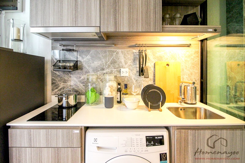 เคาน์เตอร์ครัวจุดที่ปูหินสังเคราะห์มีเตาไฟฟ้า และอ่างล้างจานอยู่ข้างกัน อาจจะไม่เหลือพื้นที่วางจานด้านบน แต่ก็สามารถย้ายไปวาง ที่โต๊ะบนเครื่องซักผ้าเมื่อสักครู่ได้นะคะ