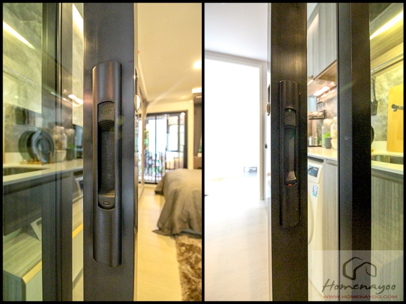 ออกมาจากห้องน้ำกันแล้ว ค่ะ เราจะพาไปชมที่ห้องนั่งเล่นกัน แต่ก่อนอื่นมาดูประตูที่กั้นระหว่างห้องครัวกับห้องนั่งเล่นกันก่อน เป็นบานอลูมิเนียมสีดำ กระจกสีเขียวตัดแสง
