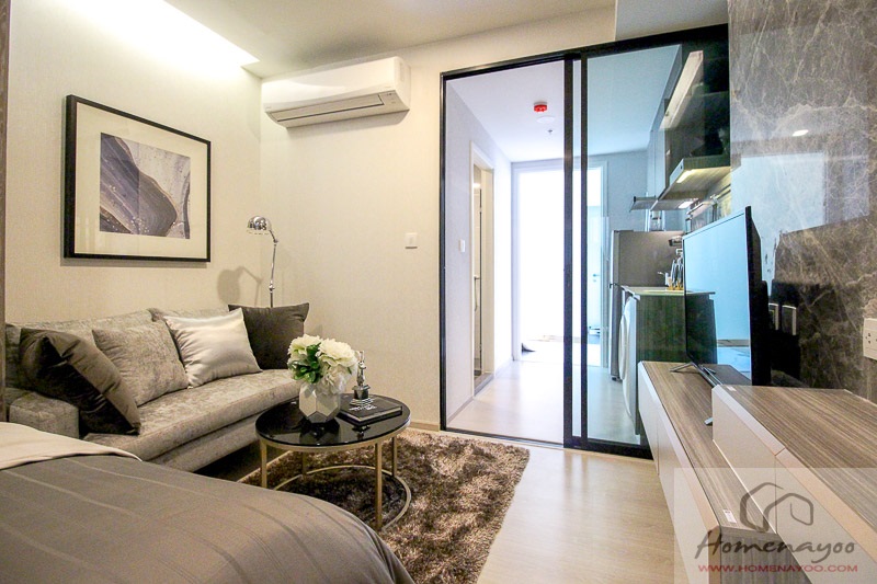 ถัดจากห้องน้ำซึ่งเป็นโซนทางเข้าห้องมาแล้วก็จะเจอกับห้องนั่งเล่น และห้องนอนที่เชื่อมต่อกันทันทีค่ะ จุดเด่นของห้องนี้อยู่ตรงนี้ คือไม่มีการแบ่งแยกโซน เหมือนอยู่หอพัก แต่มีโซนนั่งเล่นชิลๆอยู่ฝั่งติดหน้าต่าง ทำให้ห้องนี้สามารถชมวิวได้แบบเต็มๆหน้ากว้าง ห้องทั้งหมดขายแบบ Fully Furnished นะคะ จะได้เฟอร์นิเจอร์ตามนี้ทั้งหมดค่ะ ได้โซฟา, เตียง, Buildin ตู้ปลายเตียง, ตู้เสื้อผ้า