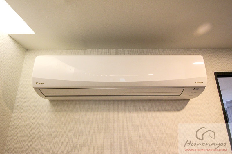 ตำแหน่งของแอร์จะอยู่ที่ผนังข้างประตูทางออกห้องครัว ยี่ห้อ Daikin