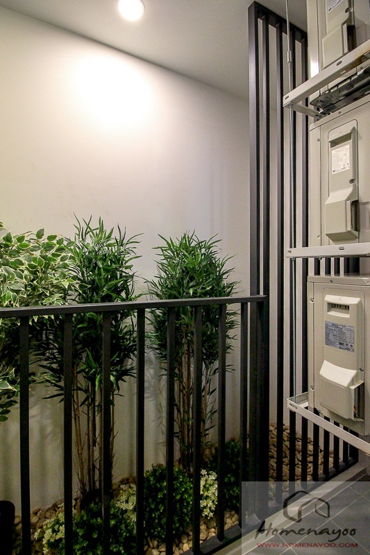 จุดติดตั้งคอล์ยร้อนแอร์ เป็นสลิงห้อยลงมาจากฝ้าเพดานระเบียง เพื่อเพิ่มพื้นที่ใช้งานให้กับระเบียง