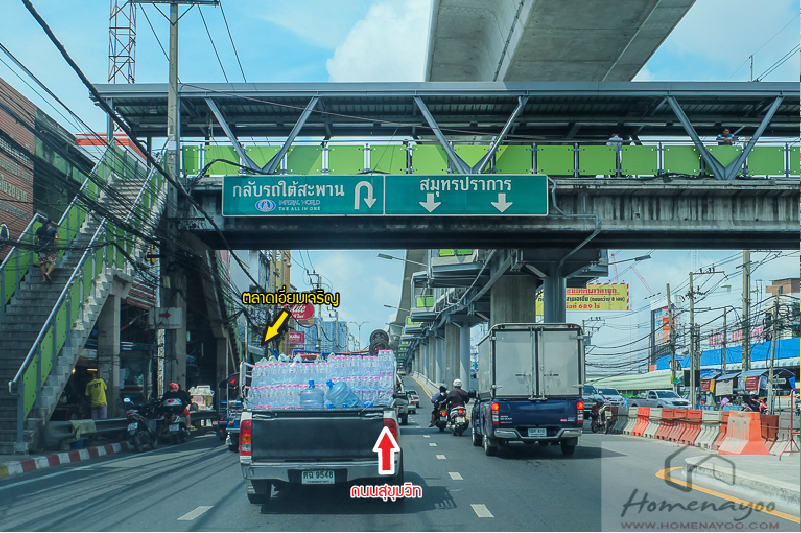 ขึ้นสะพานข้ามคลองสำโรงมา ด้านบนจะเห็น Skywalk ที่เชื่อมมาจากตัวสถานี BTS สำโรง