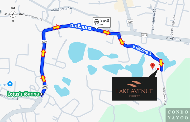 Lotus’s go fresh Supermarket เชิงทะเล ⇒ ถนนศรีสุนทร ⇒ ซอยเชิงทะเล 3 ⇒ ตรงเข้าไปประมาณ 350 ม.* ⇒ ถึงโครงการ Lake Avenue ภูเก็ต ทางฝั่งขวามือค่ะ