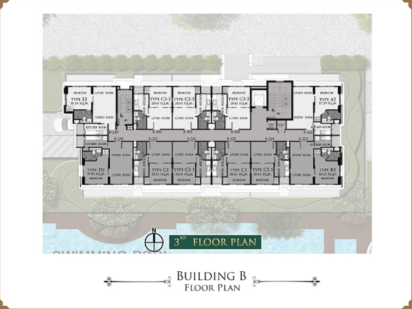 ตัวโมเดลทำมาให้ดู 1 อาคาร ครับ ที่ทำมาให้ดูคือส่วนของอาคาร B ทุกอาคารหน้าตาคล้ายๆกัน รูปทรงอาคารเน้นที่เปลือกอาคารตกแต่งสไตล์ยุโรป สถาปัตยกรรมแบบ Baroque ส่วนสระว่ายน้ำที่เห็นจะยาวตั้งแต่อาคาร A เข้ามาจนถึงอาคาร B