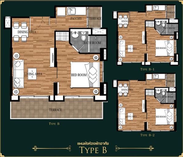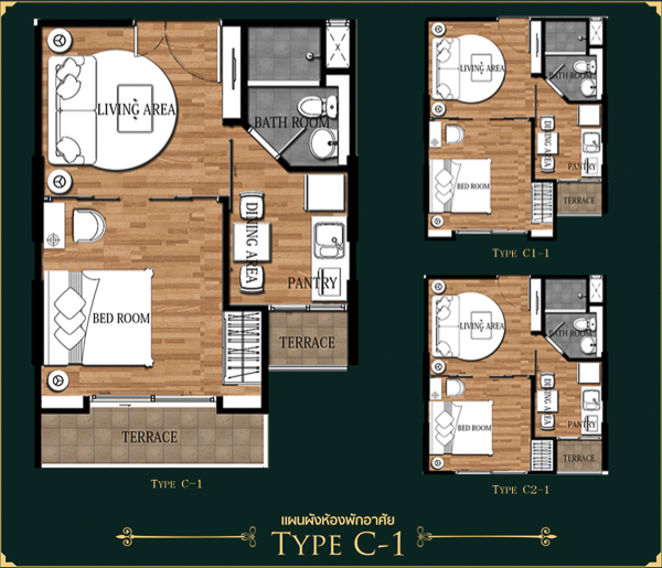 Type D-1 เดินเข้าห้องมาเจอส่วนรับประทานอาหารก่อน เชื่อมกับห้องนั่งเล่น ห้องครัวอยู่ฝั่งซ้ายติดกับประตูห้อง ได้เป็นครัวปิดเหมือนกันมีบานเลื่อนกระจกให้ 1 บาน ยาวเข้าไปด้านในครัวเป็นระเบียงหลังห้อง ติดกับส่วนห้องนั่งเล่นจะเป็นห้องนอน ห้องน้ำจะอยู่ในห้องนอน