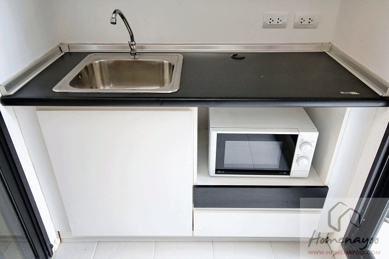 ด้านล่างท็อปครัว มีตู้เก็บของบานเปิด บานปิดผิวลามิเนต, ลิ้นชักพร้อมถาดใส่ช้อนส้อม และ ช่องสำหรับวางไมโครเวฟ