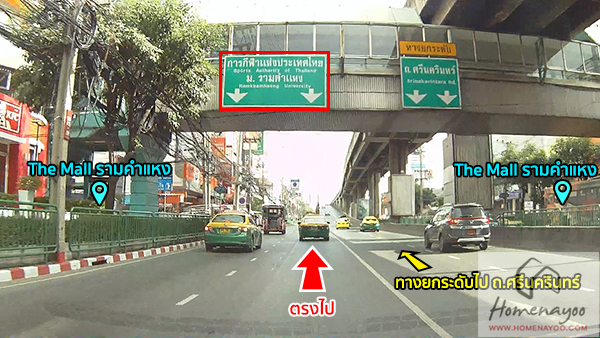 ผ่านเดอะมอลล์รามคำแหงมา ให้อยู่เลนซ้ายไว้ค่ะ ไม่ต้องขึ้นทางยกระดับ