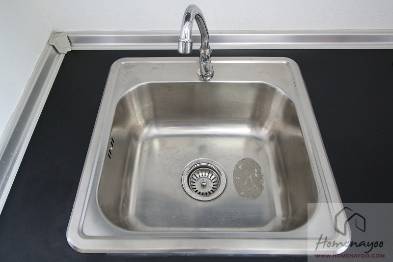 หน้าท็อปครัวลามิเนตสีเข้ม ฝังซิงค์ล้างจานหลุมเดี่ยว + ก๊อกน้ำทรงสูงก้านโยกของ Hafele