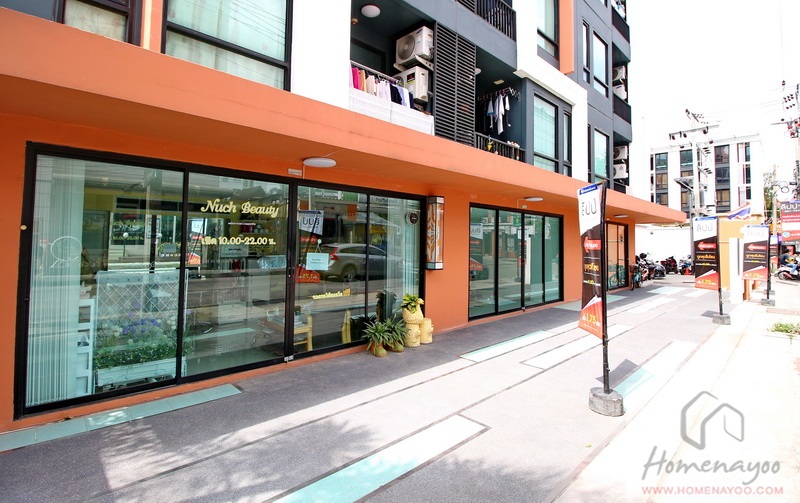 ถ่ายให้ดูด้านหน้าอพาร์ทเม้นท์ มีทั้งร้านอาหารตามสั่ง, ร้านน้ำปั่น, ร้านขายผลไม้สด, ร้านก๋วยเตี๋ยว และ V.Shop Express