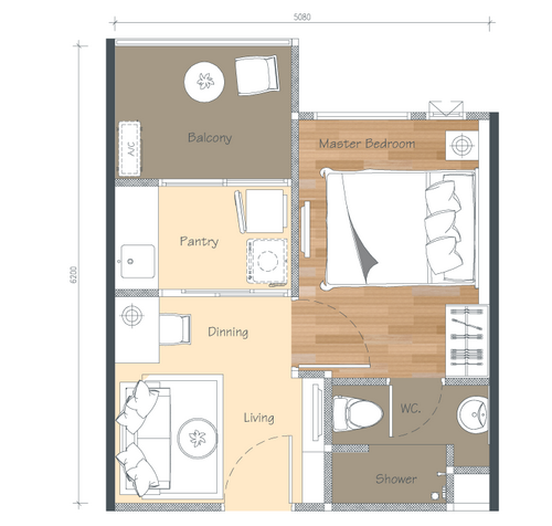 แปลนห้องตัวอย่าง TYPE A2 ขนาด 29.00 ตร.ม. ห้องพักแบบ 1 ห้องนอน, 1 ห้องน้ำ ฟังก์ชั่นการใช้งานแยกเป็น 5 ส่วนหลัก เปิดประตูเข้ามา เป็นมุมพักผ่อน + มุมรับประทานอาหาร ต่อเนื่องไปเป็นห้องครัวแบบปิดมิดชิด ติดกับห้องครัวเป็นระเบียงซักล้างขนาดใหญ่ เปิดรับวิวด้านนอกได้กว้าง ปีกขวาของห้องพักเป็นห้องนอน วางเฟอร์นิเจอร์มาตรฐานได้ครบชุด พร้อมห้องน้ำในตัว เพื่อการใช้งานได้อย่างสะดวก