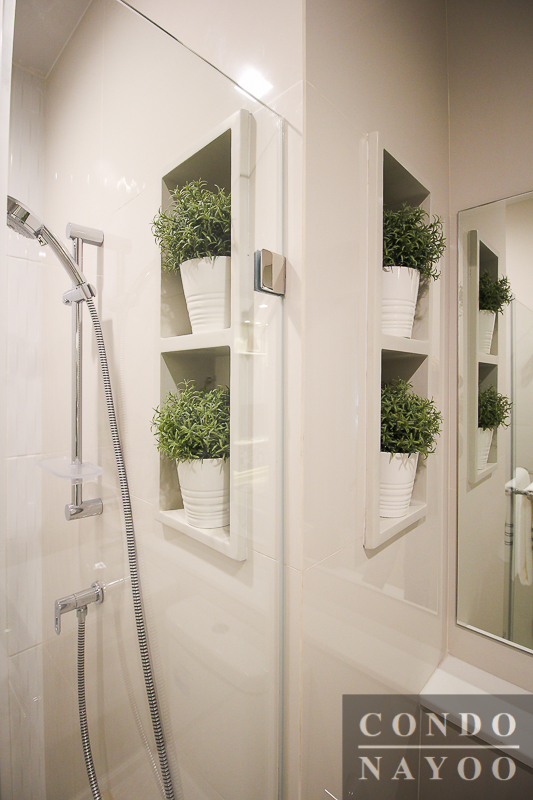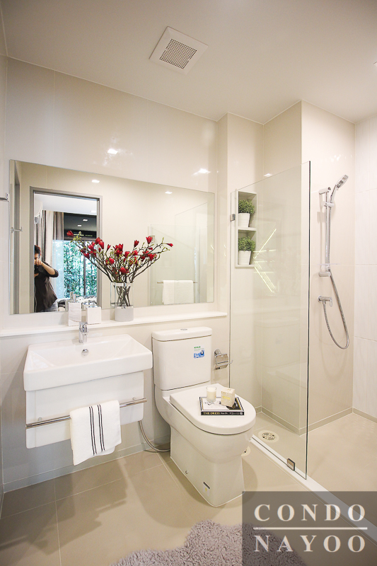 ส่วนของห้องอาบน้ำ ทางโครงการติดตั้ง Shower Box มาให้เรียบร้อย บานเปิดแบบผลักเข้าไปในห้อง มีมือจับเป็นราวที่สามารถใช้ประโยชน์ด้วยการวางพาดผ้าเช็ดตัวได้