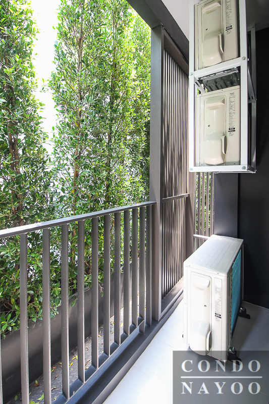 ออกมาดูที่ระเบียงภายนอก จะได้ราวกันตกเป็นเหล็กซี่สีดำ ติดตั้งคอมเพรสเซอร์แอร์แบบลอยตัว พร้อมมีกริลล์บังสายตาจากภายนอกทำให้ตัวอาคารด้านนอกดูเรียบร้อยค่ะ