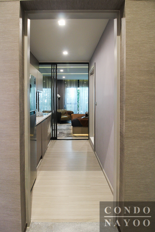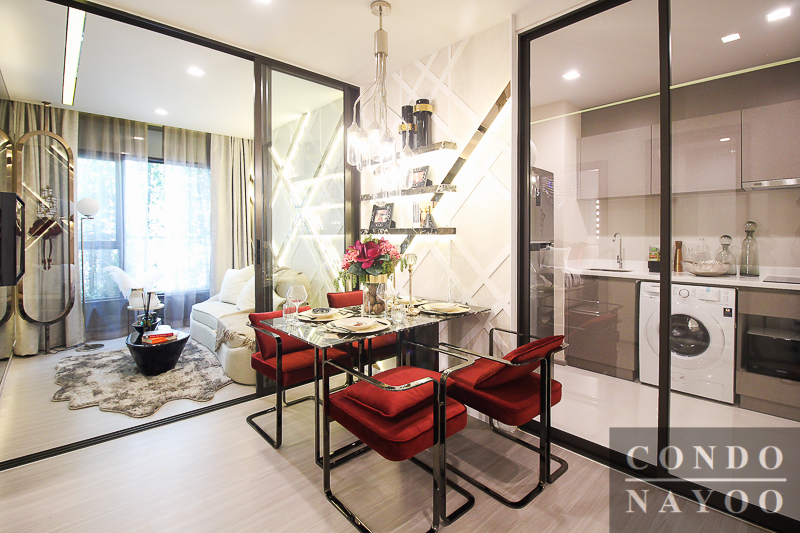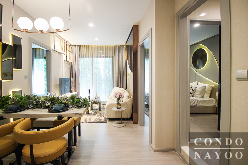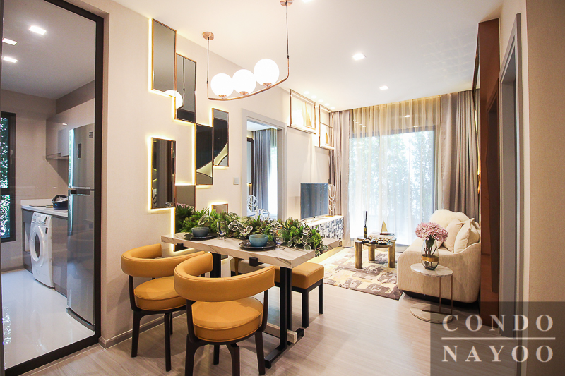 ถัดมาเราจะมาดูที่ห้องตัวอย่างแบบที่ 2 กันต่อ เป็นห้องแบบ 1 Bedroom Plus ค่ะ เมื่อเข้ามาในตัวห้องจะเจอกับพื้นที่ส่วนห้องทานอาหารก่อนเป็นส่วนแรก มองตรงไปจะเป็นห้องเอนกประสงค์ (Plus) ฝั่งซ้ายมือเป็นห้องน้ำและห้องนอน Master Bedroom และฝั่งขวามือเป็นส่วนห้องครัวค่ะ