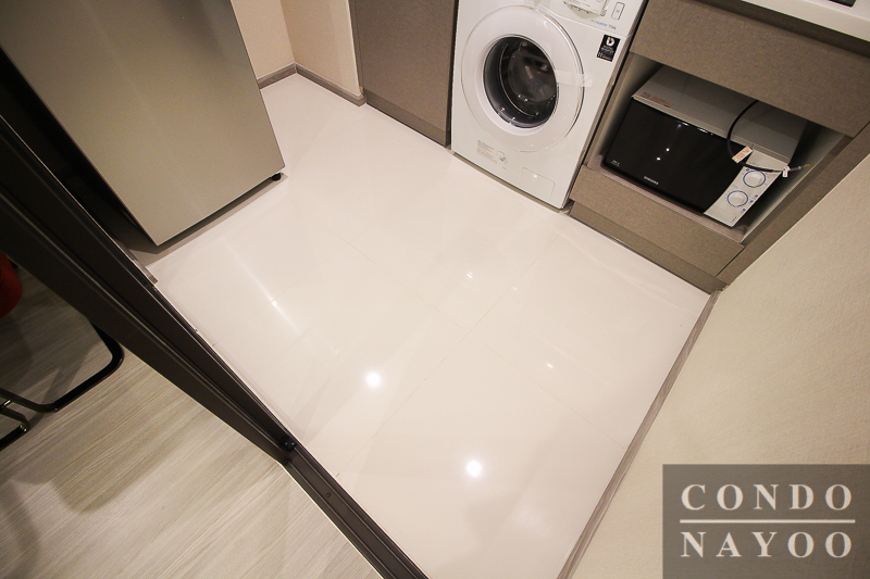 พื้นห้องครัวจะปูด้วยกระเบื้องแกรนิตโต้สีครีม ทำความสะอาดง่ายและเหมาะสำหรับใช้ในห้องครัวมากกว่าพื้นลามิเนตค่ะ