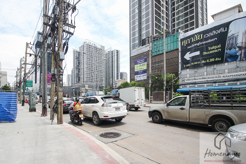 ข้ามมาฝั่งตรงข้ามเพื่อจะได้เห็นที่ตั้งโครงการที่ติดฝั่งอโศก – ดินแดงชัดๆ โดยเส้นทางคนเดินเข้าโครงการจะอยู่บริเวณนี้ แต่ทางนี้จะไม่สามารถใช้เป็นทางเข้ารถได้เพราะติดคอสะพานค่ะ