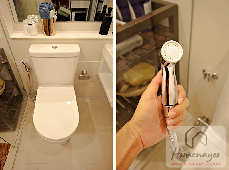 ผนังข้างฝักบัวมีมุมมาให้ใช้วางชั้นวางของได้อย่างในห้องตัวอย่าง ซึ่งถ้าทำชั้น built in ก็จะช่วยเพิ่มพื้นที่ใช้สอยได้เยอะเลยทีเดียว