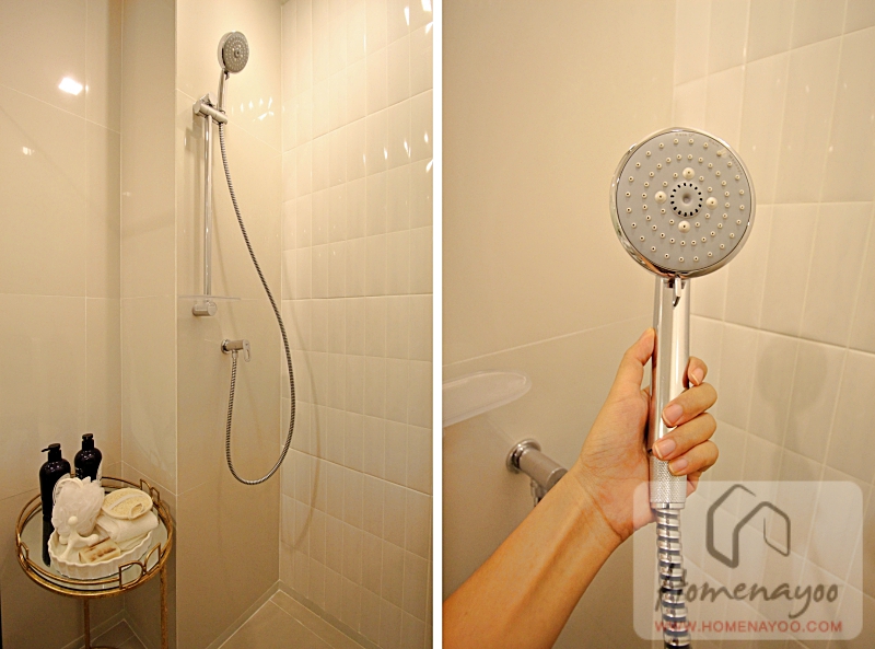 ในห้องอาบน้ำติดตั้งชุดฝักบัวแบบปรับระดับสูงต่ำได้ และฝักบัวเป็นเป็นแบบปรับระดับขนาดหยดน้ำได้ เทียบฝ่ามือให้เห็นขนาดฝักบัว จะเห็นว่ามีขนาดกำลังเหมาะมือดี