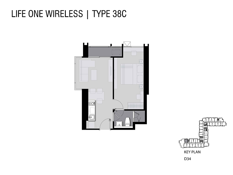 เดินเข้าห้องมาจะเจอส่วนของห้องนั่งเล่นก่อน ฝั่งซ้ายมือของห้องนั่งเล่นเป็นส่วนครัวและห้องนำ้ มองตรงไปเป็นส่วนห้องนอนมีฉากกั้นระหว่างห้องนอนกับห้องนั่งเล่นมาให้ พื้นห้องนอนกับห้องนั่งเล่นจะเป็นไม้ลามิเนตสีอ่อนหนา 8 mm., พื้นห้องครัวได้เป็นกระเบื้องกรานิตโต้ขนาด 60 x 60 cm.