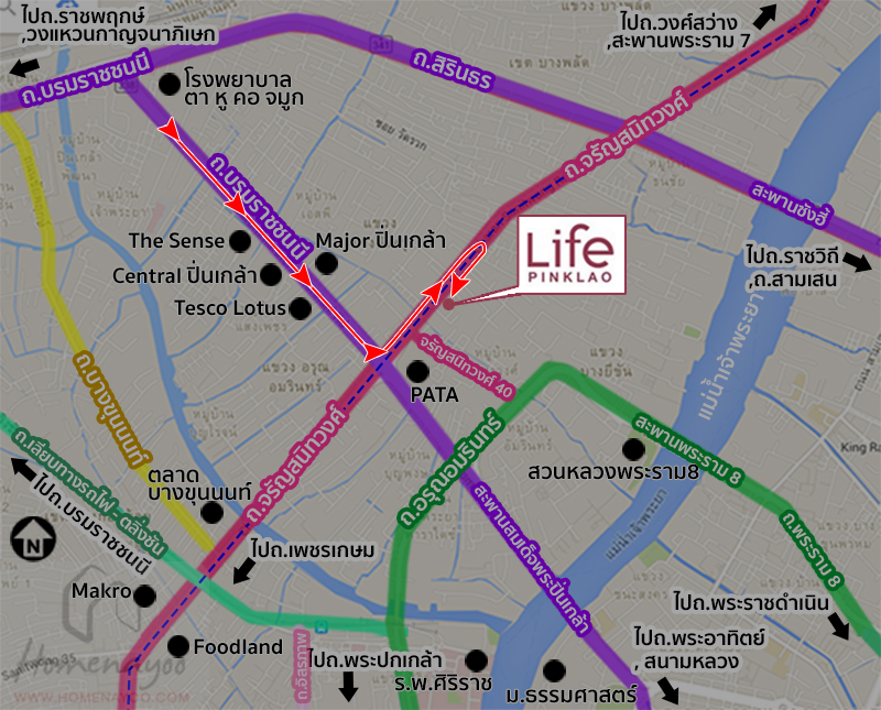 สำหรับคนขับรถ วันนี้เรามีภาพการเดินทางจากรถมาให้ชมกันค่ะ เส้นทางการเดินทางตามลูกศรแดง โดยเริ่มเดินทางจาก ถนนบรมราชชนนี → เลี้ยวซ้ายมาถนนจรัญสนิทวงศ์ → กลับรถมาถนนจรัญสนิทวงศ์ฝั่งโครงการ → จะเจอโครงการ Life ปิ่นเกล้า อยู่ทางซ้ายมือ โดยโครงการจะอยู่ถัดจากซอยจรัญ 40 มาประมาณ 70 เมตร