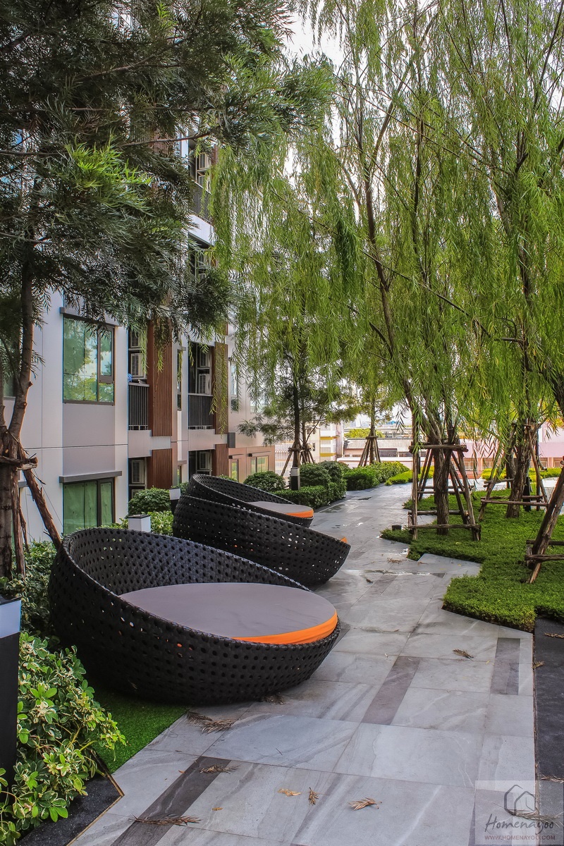 พื้นถนนส่วนทางเข้าเป็นคอนกรีตสแตมป์ ชอบต้นไม้ที่โครงการเลือกใช้ค่ะ ปลูกต้นหลิวไว้เยอะเลย ส่วนใบจะพริ้วตามลมตลอด ดูมีเอกลักษณ์ไม่เหมือนใครและให้ความรู้สึกผ่อนคลายดี สวนชั้นล่างของโครงการออกแบบตามแนวคิด “Mura” A Village within Nature เป็นการผสมผสานระหว่างรูปแบบแนวคิดญี่ปุ่น ที่ออกแบบมาอย่างละเมียดละไม อย่างการเข้ารอยต่อของวัสดุไม้ที่พิถีพิถันอย่างลงตัว ผสมผสานกับการเอาความเป็นธรรมชาติเข้ามาอยู่ใกล้ตัวมากขึ้น