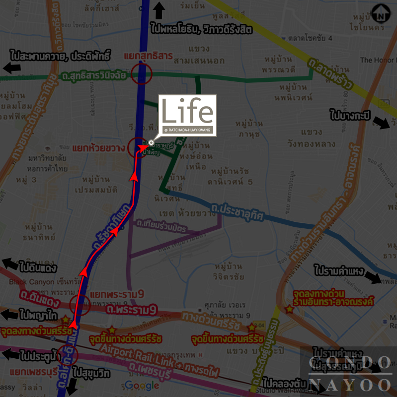 วันนี้เรามีภาพการเดินทางโดยรถมาให้ชมกันค่ะ เส้นทางการเดินทางตามลูกศรแดง โดยเริ่มเดินทางจาก แยกพระราม 9 → ถนนรัชดาภิเษก → ถึงแยกห้วยขวางเลี้ยวขวาเข้าถนนประชาราษฏร์บำเพ็ญ → เข้าไปประมาณ 80 เมตร จะเจอโครงการ Life รัชดา-ห้วยขวาง อยู่ฝั่งซ้ายมือแล้วค่ะ