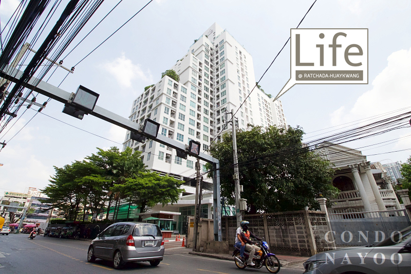 มองขึ้นไปจะเห็นว่าคอนโด Life รัชดา-ห้วยขวาง มีการทาสีใหม่จากสีเก่าครีมน้ำตาล เป็นขาวแต่งเทา ดูใหม่ขึ้นกว่าเดิมค่ะ