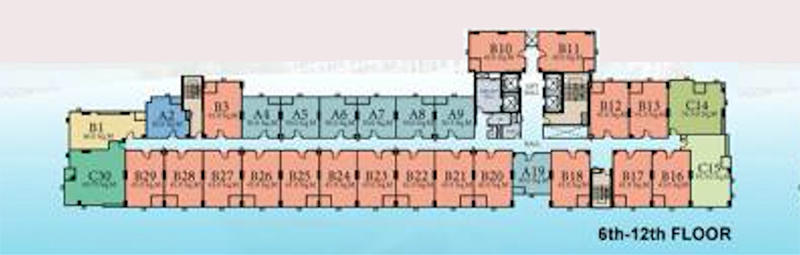 ผังชั้น 6-12 เป็น Typical Floor Plan คือจัดผังเหมือนกันหมด โถงทางเดินเป็นแบบ Double Corridor คือแจกเข้าห้องพักทั้งสองฝั่ง จัดโถงลิฟต์ไว้ตรงกลาง มีลิฟต์โดยสาร 3 ตัว และ ลิฟต์บริการ 1 ตัว ทางเข้าแยกกันเป็นสัดส่วน