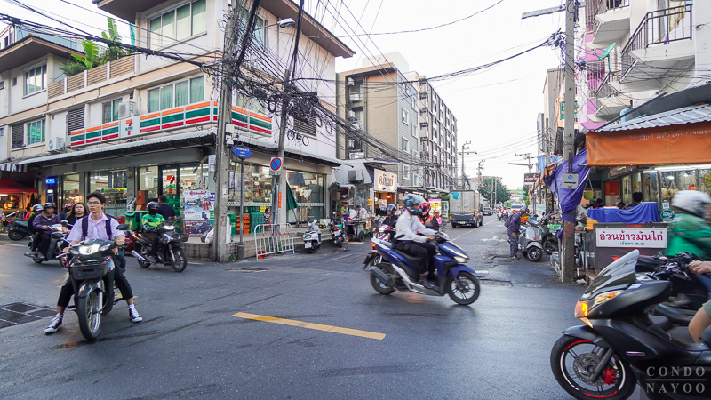 มองไปทางขวามือจะเป็นซอยรัชดา แยก 4 ซึ่งด้านหน้าก็จะมีร้านอาหาร และ 7-Eleven เปิดอยู่ด้วยค่ะ