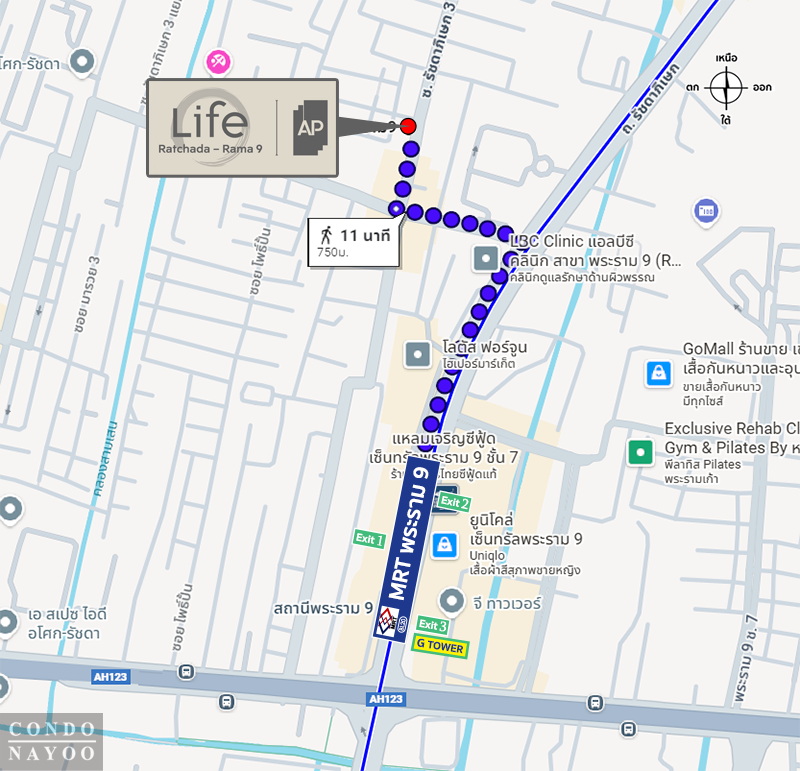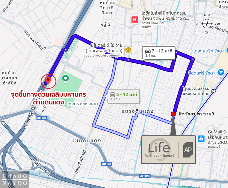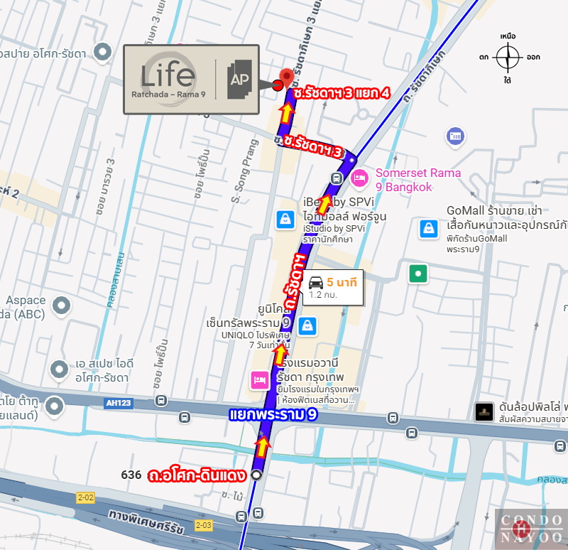 แยกพระราม 9 ⇒ ถนนรัชดาภิเษก ⇒ ซอยรัชดาภิเษก 3 ⇒ ซอยรัชดาภิเษก แยก 4 ⇒ ถึงโครงการ Life รัชดา-พระราม 9 ทางฝั่งซ้ายมือ*