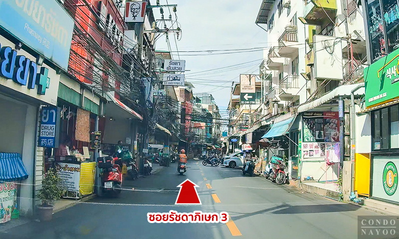 บรรยากาศภายในซอยรัชดา 3 จะเป็นซอยที่ค่อนข้างแคบและรถเยอะ เวลาเดินเข้า-ออกต้องระวังรถหน่อย แต่ตลอดสองข้างทางจะมีร้านค้า ร้านอาหาร ทำให้บรรยากาศดูคึกคักไม่เปลี่ยว