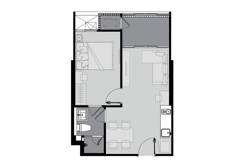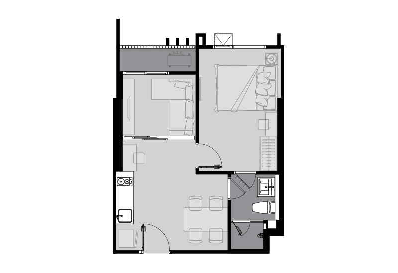 จากห้องนั่งเล่นจะมีทางเดินแจกไปส่วนห้องน้ำ และห้องนอนทั้ง 2 ห้อง