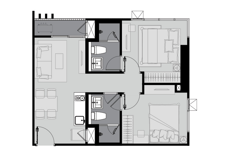 อย่างนึงที่เราชอบเกี่ยวกับการจัดผังห้องนอนแบบ 2 ห้องนอนนี้ คือห้องนอนทั้ง 2 ห้องมีขนาดพอๆกัน ห้องนอนเล็กนี่วางเตียงคู่ 5 ฟุตมาให้ดูระยะใช้งาน จะเห็นระยะเดินรอบๆกำลังสวย วางตู้เสื้อผ้าและโต๊ะข้างเตียงได้สบายๆ และมีประตูเปิดไปห้องน้ำจากในห้องได้