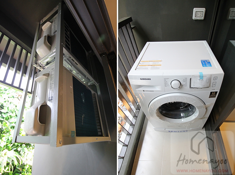 ส่วนแอร์คอมเพรสเซอร์แขวนมาให้ทั้ง 2 เครื่อง ทำให้สามารถใช้พื้นที่ใต้แอร์คอมเพรสเซอร์ได้อยู่ เช่นใช้วางเครื่องซักผ้าแบบฝาหน้าแบบในห้องตัวอย่างเป็นต้น พร้อมมีเต้าเสียบปลั๊กไฟพร้อมฝาครอบกันน้ำติดมาให้เรียบร้อย