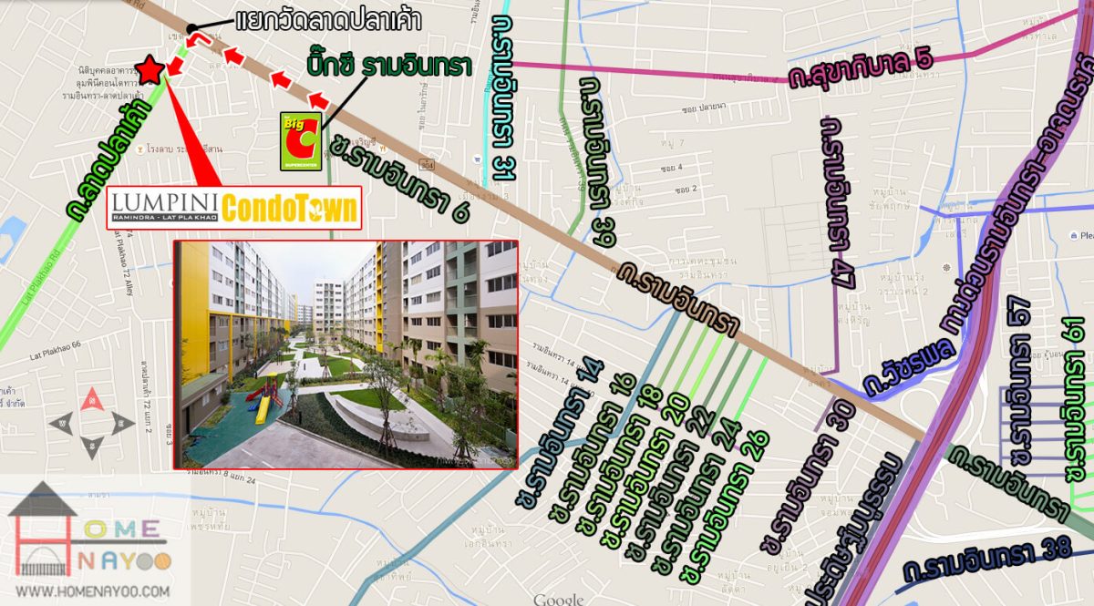การเดินทาง ผมเริ่มจาก ถนนรามอินทรา หน้าห้างบิ๊กซี รามอินทรา > เลี้ยวซ้ายเข้าสู่ ถนน รามอินทรา > เลี้ยวซ้ายเข้าสู่ ถนน ลาดปลาเค้า > คอนโด ลุมพินี ทาวน์ รามอินทรา-ลาดปลาเค้า *จากปากซอย 200 เมตร ถึงโครงการ