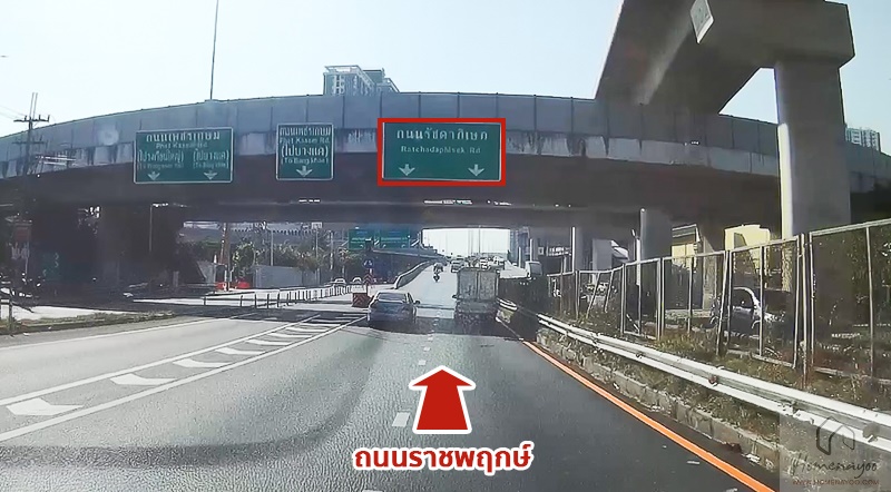 พอเราลงมาจากสะพานแล้ว ให้เราชิดขวาเพื่อขึ้นสะพานยกระดับ มุ่งหน้าไปทางถนนกาญจนาภิเษก