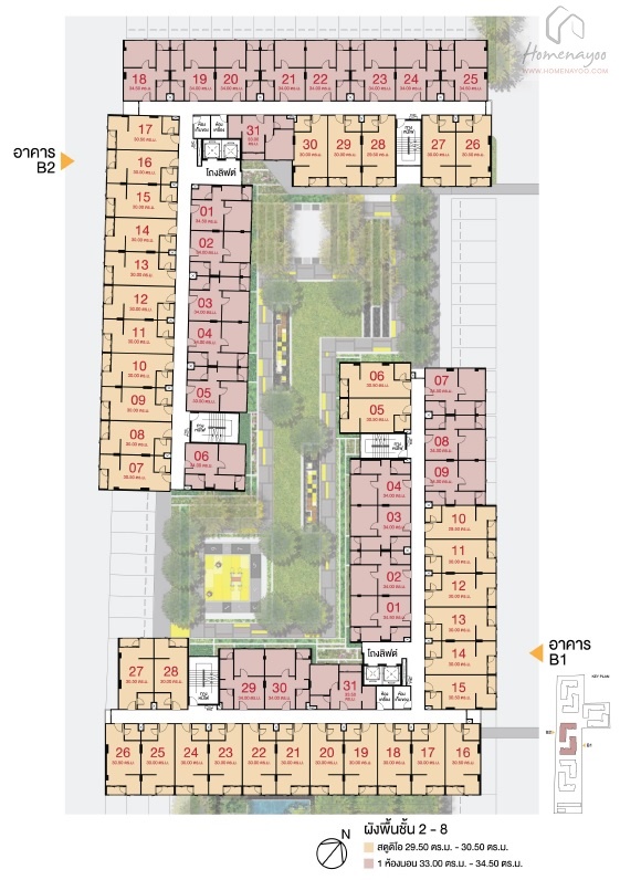ตั้งแต่ชั้น 2 เป็นต้นไป ก็จะเป็น Typical Floor Plan เป็นส่วนของห้องพักอาศัยทั้งหมด โดยจะมีห้องพักอาศัยอยู่ที่ 31 ห้อง/ชั้น ทุกอาคารค่ะ