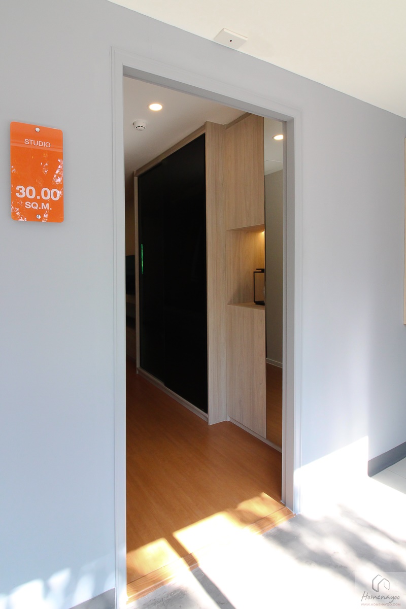 สำหรับห้องตัวอย่างที่จะพาเข้าไปชมจะมีขนาดอยู่ที่ 30 ตร.ม. เริ่มจากประตูทางเข้าห้องเป็นประตูบานทึบ