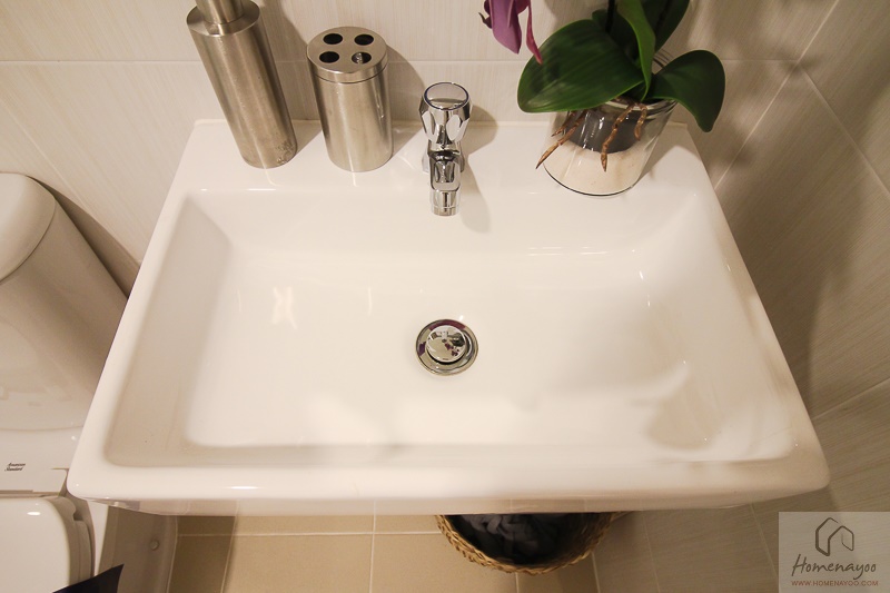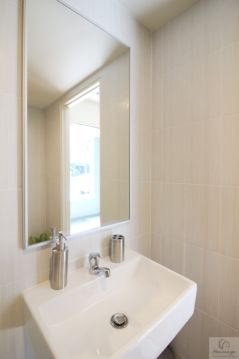 ชิ้นแรกเป็นอ่างล้างมือแบบแขวนผนัง ขนาดกำลังดี มีพื้นที่ขอบอ่างพอวางของใช้กระจุกกระจิกได้ ติดตั้งมาพร้อมกับก๊อกน้ำและกระจกเงา