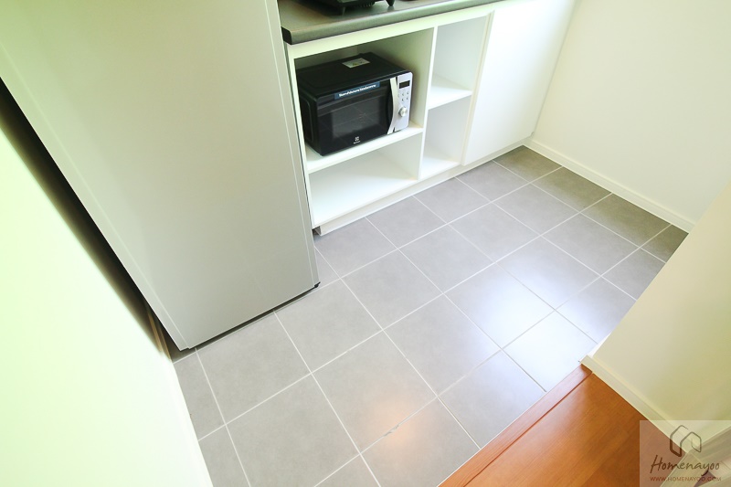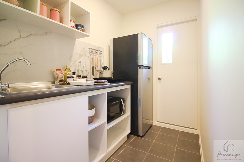 ในส่วนของห้องครัวมีการออกแบบให้แยกส่วนออกไป ถ้าใครที่ชอบครัวปิด ก็สามารถติดตั้งประตูบานเลื่อนกระจกที่บริเวณหน้าห้องเพิ่มได้เลย พื้นครัวปูด้วยกระเบื้องเซรามิก ทำให้สามารถทำความสะอาดพวกคราบอาหารได้ง่ายกว่า เวลาทำเลอะเทอะเปรอะเปื้อนก็ไม่ต้องกลัวว่าพื้นจะบวมหรือเป็นรอยถาวร