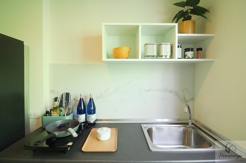 บน Top เคาน์เตอร์ปิดผิวด้วยเมลามีน กันน้ำกันรอยขีดข่วนได้ดี มีอ่างล้างจานขนาด 1 หลุมติดตั้งมาให้ พร้อมกับติด Backsplash ที่ผนังด้านหลัง แล้วยังเหลือพื้นที่ในการเตรียมอาหารอีกพอสมควร ครัวนี้เหมาะสำหรับการเตรียมอาหารเบา ๆ นะคะ แต่สำหรับคนที่ชอบทำอาหาร ก็ยังเหลือพื้นที่ให้สำหรับวางเตาไฟฟ้าได้