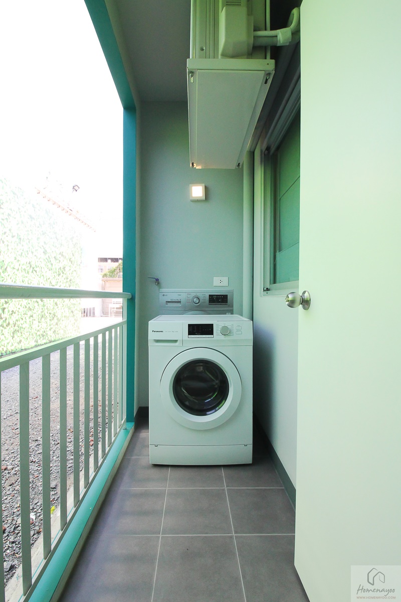 ส่วนระเบียงจะเป็นจุดที่ใช้วางเครื่องซักผ้า, ตากผ้า และวาง Compressor ได้ พื้นจะปูด้วยกระเบื้องเซรามิก และมีราวกันตกเป็นระแนงเหล็กติดตั้งมาให้ตามภาพค่ะ
