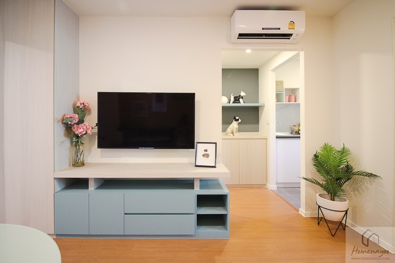 ส่วนฝั่งตรงข้ามก็วางชั้นวางทีวีขนาดใหญ่ได้แบบนี้ จะทำ Built-in เป็นชั้นเก็บของให้เป็นชิ้นเดียวกับตู้เสื้อผ้าเลยก็ได้นะ