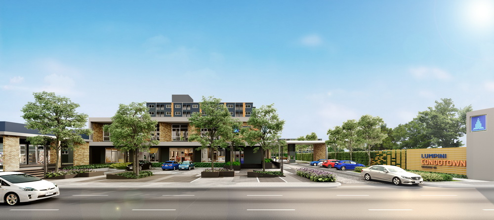 ภาพจำลองบรรยากาศโครงการบริเวณหน้าซุ้มทางเข้าและอาคารสันทนาการ ชั้นล่างจะเป็นร้านค้าทั้งหมด 5 ยูนิตด้วยกัน