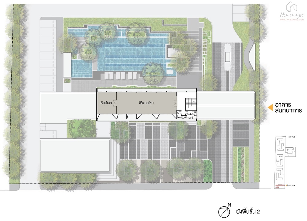 พื้นที่หน้าสุดของโครงการมีอาคาร 2 ชั้นเป็น Main Facilities ชั้นล่างมีร้านค้าสำหรับอำนวยความสะดวกลูกบ้านภายในโครงการ และมีสระว่ายน้ำ ส่วนชั้นบนเป็นส่วนของห้องฟิตเนส และห้องโยคะค่ะ