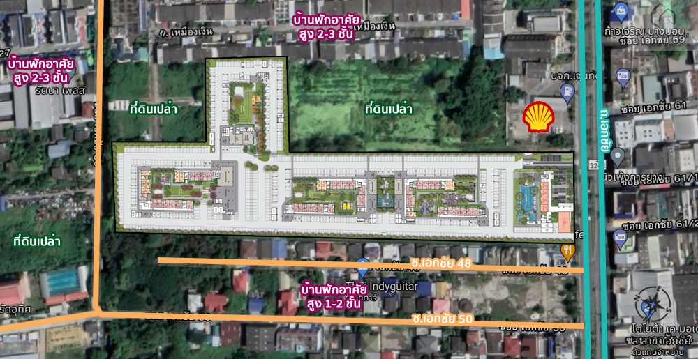 สำหรับที่ดินของโครงการนั้นจะอยู่ติดกับถนนเอกชัยตามที่เห็นในภาพกราฟิกเลยค่ะ โดยรอบโครงการส่วนใหญ่จะเป็นบ้านพักอาศัยและอาคารพักอาศัย ส่วนพื้นที่ที่อยู่ติดถนนเอกชัยจะเป็นอาคารพาณิชย์เพื่อทำการค้า
