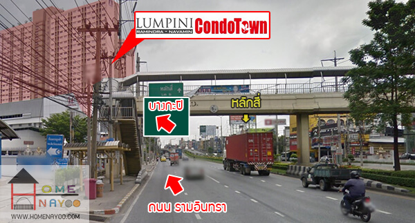 จากนั้นจะเห็นป้ายให้แยกซ้ายออกไป บางกะปิ จากตรงนี้จะมองเห็นตึกโครงการ ลุมพินี คอนโดทาวน์ รามอินทรา-นวมินทร์ ครับ