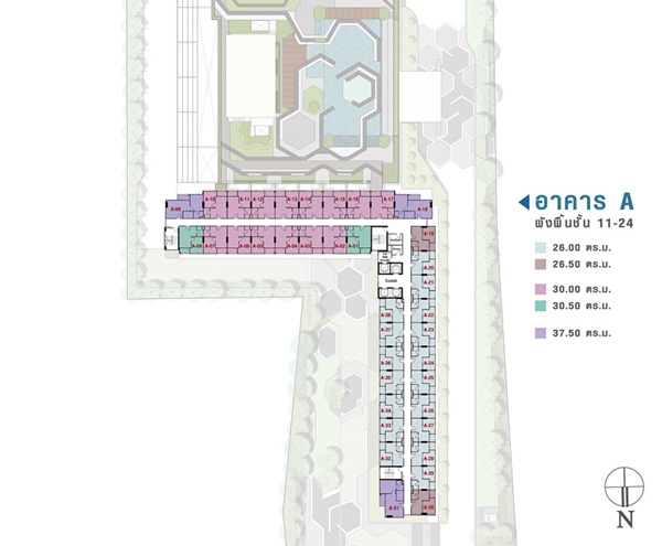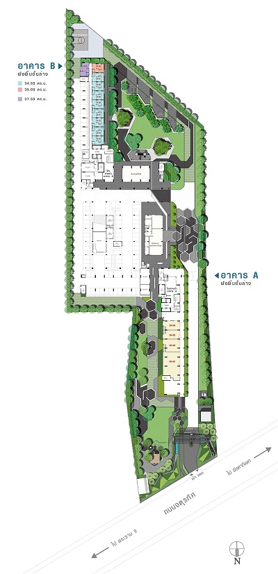 ภาพรวมผังบริเวณชั้นล่าง มีสวนใหญ่ๆอยู่สองจุดที่บริเวณทางเข้าและด้านท้ายโครงการ จุด Drop off และทางขึ้นลานจอดรถอยู่ระหว่างอาคาร A และ B